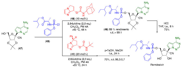 Já na segunda proposta de síntese foi descrita uma melhora significativa na etapa de fosforamidação, ao utilizar a unidade fosforilada p-nitrofenolada diastereomericamente pura 45 no acoplamento com o derivado nucleosídico 42, mediado por (i-Pr)2NEt e MgCl2, em acetonitrila, o qual ocorre com inversão da estereoquímica do átomo de fósforo, levando ao intermediário 46.45 Após a etapa final de desproteção do grupo isopropilideno e purificação por coluna flash, Remdesivir foi isolado em 69% de rendimento. Como principal vantagem desse protocolo destaca-se a eliminação da separação por CLAE, uma vez que o diasteroisômero puro do precursor 45 foi previamente preparado e isolado via cristalização seletiva em éter diisopropílico da mistura racêmica precursora (39% de rendimento).46 Por outro lado, etapas adicionais de proteção das hidroxilas através de um acetonídeo e sua posterior desproteção foram necessárias, levando a um aumento no número de etapas. No que se refere às novas estratégias de fosforamidação, todas datam de 2020 e 2021 e envolvem estratégias modernas, como catálise assimétrica e processos one-pot. Em 2020, Zhang e colaboradores descreveram a primeira síntese assimétrica catalítica do Remdesivir (Esquema 20), empregando o catalisador imidazólico bicíclico quiral adamantil-carbamato 48 em uma transformação cinético dinâmica assimétrica.47 Esse acoplamento eficiente se deu entre o racemato do cloridrato de fosforoamidoíla 43 e o derivado nucleosídico protegido 47, levando ao produto 46 em até 96% de conversão e razão diasteroisomérica de 22:1. O potencial para aplicação industrial dessa nova metodologia de fosforamidação foi demonstrado em um experimento partindo de 10,0 g do substrato 47, fornecendo o intermediário 46 em 89% de rendimento e razão diastereoisomérica > 99:1 e o Remdesivir em 73% de rendimento, após etapa de remoção do grupo isopropilideno.