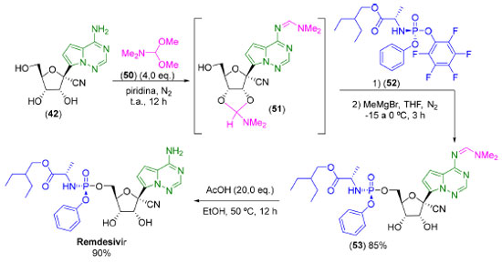 Uma segunda abordagem de fosforamidação estereosseletiva bastante similar também foi descrita por outro grupo de pesquisa, utilizando o catalisador imidazólico bicíclico quiral 49 (Esquema 20).48 A inovação dessa proposta pode ser atribuída ao emprego de um processo one-pot, potencialmente atrativo do ponto de vista industrial, compreendendo as etapas de fosforamidação e remoção do grupo protetor da unidade nucleosídica e levando ao Remdesivir em 70% de rendimento e 99,3:0,7 r.d. Recentemente, Shen e colaboradores utilizaram a N,N-dimetilformamida dimetil acetal (50) como grupo protetor da unidade nucleosídica a ser acoplada com a porção fosforoamidato quiral (Esquema 21).49 Os pesquisadores mostraram que a proposta sintética, desenvolvida originalmente para a síntese one-pot do antiviral Molnupiravir, pode ser aplicada também às etapas finais de síntese do Remdesivir. Assim, foi realizada a proteção das hidroxilas 2' e 3' de 42 com 50, seguida do acoplamento no mesmo frasco reacional da unidade nucleosídica 51 com a fosforoamida pentafluorada 52 e a remoção do grupo 2',3'-O-dimetilaminometileno pelo agente de desproteção MeMgBr, levando ao intermediário 53 em 85% de rendimento para as três etapas (Esquema 21). Finalmente, a desproteção do grupo amina foi realizada utilizando-se ácido acético em etanol, resultando no Remdesivir em 90% de rendimento. Esse trabalho é uma importante contribuição, em virtude da proposta inovadora de substituição do grupo protetor acetonídeo, da abordagem one-pot e do aumento do rendimento obtido.