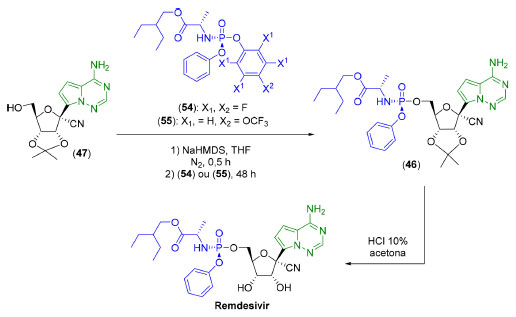 REFERÊNCIAS 1. De Clercq, E.; Li, G.; Clin. Microbiol. Rev. 2016, 29, 695. 2. Leite, D. I.; Faria, J. V.; de Azevedo, L. D.; Figueiredo, Y. V.; Martins, W. A.; Bianco, M. da C. A. D.; Bernardino, A. M. R.; Bastos, M. M.; Boechat, N.; Rev. Virtual Quim. 2015, 7, 2347. 3. Hardy, M. A.; Wright, B. A.; Bachman, J. L.; Boit, T. B.; Haley, H. M. S.; Knapp, R. R.; Lusi, R. F.; Okada, T.; Tona, V.; Garg, N. K.; Sarpong, R.; ACS Cent. Sci. 2020, 6, 1017. 4. Dömling, A.; Gao, L.; Chem 2020, 6, 1283. 5. Hashemian, S. M.; Farhadi, T.; Velayati, A. A.; Drug Des. Devel. Ther. 2020, 14, 3215. 6. Eastman, R. T.; Roth, J. S.; Brimacombe, K. R.; Simeonov, A.; Shen, M.; Patnaik, S.; Hall, M. D.; ACS Cent. Sci. 2020, 6, 672. 7. Sreekanth Reddy, O.; Lai, W.; ChemBioChem 2021, 22, 939. 8. Zanella, I.; Zizioli, D.; Castelli, F.; Quiros-Roldan, E.; Pharmaceuticals 2021, 14, 454. 9. Clososki, G. C.; Soldi, R. A.; da Silva, R. M.; Guaratini, T.; Lopes, J. N. C.; Pereira, P. R. R.; Lopes, J. L. C.; dos Santos, T.; Martins, R. B.; Costa, C. S.; de Carvalho, A. N.; daSilva, L. L. P.; Arruda, E.; Lopes, N. P.; J. Braz. Chem. Soc. 2020, 31, 1552. 10. Halford, B.; C&EN Glob. Enterp. 2020, 98, 22. 11. Cox, R. M.; Wolf, J. D.; Plemper, R. K.; Nat. Microbiol. 2021, 6, 11. 12. Liang, C.; Tian, L.; Liu, Y.; Hui, N.; Qiao, G.; Li, H.; Shi, Z.; Tang, Y.; Zhang, D.; Xie, X.; Zhao, X.; Eur. J. Med. Chem. 2020, 201, 112527. 13. Al-Tannak, N. F.; Novotny, L.; Alhunayan, A.; Sci. Pharm. 2020, 88, 29. 14. Buckland, M. S.; Galloway, J. B.; Fhogartaigh, C. N.; Meredith, L.; Provine, N. M.; Bloor, S.; Ogbe, A.; Zelek, W. M.; Smielewska, A.; Yakovleva, A.; Mann, T.; Bergamaschi, L.; Turner, L.; Mescia, F.; Toonen, E. J. M.; Hackstein, C.-P.; Akther, H. D.; Vieira, V. A.; Ceron-Gutierrez, L.; Periselneris, J.; Kiani-Alikhan, S.; Grigoriadou, S.; Vaghela, D.; Lear, S. E.; Török, M. E.; Hamilton, W. L.; Stockton, J.; Quick, J.; Nelson, P.; Hunter, M.; Coulter, T. I.; Devlin, L.; Bradley, J. R.; Smith, K. G. C.; Ouwehand, W. H.; Estcourt, L.; Harvala, H.; Roberts, D. J.; Wilkinson, I. B.; Screaton, N.; Loman, N.; Doffinger, R.; Lyons, P. A.; Morgan, B. P.; Goodfellow, I. G.; Klenerman, P.; Lehner, P. J.; Matheson, N. J.; Thaventhiran, J. E. D.; Nat. Commun. 2020, 11, 6385. 15. http://www.fda.gov/drugs/news-events-human-drugs/remdesivir-veklury-approval-treatment-covid-19-evidence-safety-and-efficacy acessada em agosto 2021. 16. http://www.gov.br/saude/pt-br/coronavirus/publicacoes-tecnicas/notas-tecnicas/nota-tecnica-rendesivir-covid-19 acessada em agosto 2021. 17. Byléhn, F.; Menéndez, C. A.; Perez-Lemus, G. R.; Alvarado, W.; de Pablo, J. J.; ACS Cent. Sci. 2021, 7, 164. 18. Kokic, G.; Hillen, H. S.; Tegunov, D.; Dienemann, C.; Seitz, F.; Schmitzova, J.; Farnung, L.; Siewert, A.; Höbartner, C.; Cramer, P.; Nat. Commun. 2021, 12, 279. 19. Yan, V. C.; Muller, F. L.; ACS Med. Chem. Lett. 2020, 11, 1361. 20. http://stories.gilead.com/articles/an-open-letter-from-daniel-oday-june-29 acessada em agosto 2021. 21. Patil, S. A.; Otter, B. A.; Klein, R. S.; J. Heterocycl. Chem. 1994, 31, 781. 22. O'Connor, S.; Dumas, J.; Lee, W.; Dixon, J.; Cantin, D.; Gunn, D.; Burke, J.; Phillips, B.; Lowe, D.; Shelekhin, T.; Wang, G.; Ma, X.; Ying, S.; Mcclure, A.; Achebe, F.; Lobell, M.; Ehrgott, F.; Iwuagwu, C.; Parcella, K.; US Pat. US8431695B2 2006. 23. Dixon, J. A.; Phillips, B.; Achebe, F.; Kluender, H. C. E.; Newcom, J.; Parcella, K.; Magnuson, S.; Hong, Z.; Zhang, Z.; Liu, Z.; Khire, U.; Wang, L.; Michels, M.; Chandler, B.; O'Connor, S.; US Pat. US8143393B2 2006. 24. Paymode, D. J.; Cardoso, F. S. P.; Agrawal, T.; Tomlin, J. W.; Cook, D. W.; Burns, J. M.; Stringham, R. W.; Sieber, J. D.; Gupton, B. F.; Snead, D. R.; Org. Lett. 2020, 22, 7656. 25. Knapp, R. R.; Tona, V.; Okada, T.; Sarpong, R.; Garg, N. K.; Org. Lett. 2020, 22, 8430. 26. dos Santos, J. A.; Pereira, V. R. D.; da Silva, A. D.; Amarante, G. W.; J. Braz. Chem. Soc. 2021, 32, 1391. 27. Siegel, D.; Hui, H. C.; Doerffler, E.; Clarke, M. O.; Chun, K.; Zhang, L.; Neville, S.; Carra, E.; Lew, W.; Ross, B.; Wang, Q.; Wolfe, L.; Jordan, R.; Soloveva, V.; Knox, J.; Perry, J.; Perron, M.; Stray, K. M.; Barauskas, O.; Feng, J. Y.; Xu, Y.; Lee, G.; Rheingold, A. L.; Ray, A. S.; Bannister, R.; Strickley, R.; Swaminathan, S.; Lee, W. A.; Bavari, S.; Cihlar, T.; Lo, M. K.; Warren, T. K.; Mackman, R. L.; J. Med. Chem. 2017, 60, 1648. 28. von Keutz, T.; Williams, J. D.; Kappe, C. O.; Org. Process Res. Dev. 2020, 24, 2362. 29. Souza Neto, P.; Guimarães, B.; Freitas, J.; Oliveira, R.; Freitas Filho, J.; Quim. Nova 2020, 44, 432. 30. Liao, H.; Ma, J.; Yao, H.; Liu, X.-W.; Org. Biomol. Chem. 2018, 16, 1791. 31. Patil, S. A.; Otter, B. A.; Klein, R. S.; Tetrahedron Lett. 1994, 35, 5339. 32. Butler, T.; Cho, A.; Graetz, B. R.; Kim, C. U.; Metobo, S. E.; Saunders, O. L.; Waltman, A. W.; Xu, J.; Zhang, L.; WO Pat. WO2011035250A1 2010. 33. Butler, T.; Cho, A.; Kim, C. U.; Parrish, J.; Saunders, O. L.; Zhang, L.; US Pat. US8008264B2 2009. 34. Butler, T.; Cho, A.; Graetz, B. R.; Kim, C. U.; Metobo, S. E.; Saunders, O. L.; Waltman, A. W.; Xu, J.; Zhang, L.; US Pat. US10023600B2 2010. 35. Metobo, S. E.; Xu, J.; Jie; Saunders, O. L.; Butler, T.; Aktoudianakis, E.; Cho, C.; Kim, C. U.; Tetrahedron Lett. 2012, 53, 484. 36. Axt, S. D.; Badalov, P. R.; Brak, K.; Campagna, S.; Chtchemelinine, A.; Doerffler, E.; Frick, M. M.; Gao, D.; Heumann, L. V.; Hoang, B.; Lew, W.; Milburn, R. R.; Neville, S. T.; Ross, B.; Rueden, E.; Scott, R. W.; Siegel, D.; Stevens, A. C.; Tadeus, C.; Vieira, T.; Waltman, A. W.; Wang, X.; Whitcomb, M. C.; Wolfe, L.; Yu, C.-Y.; WO Pat. WO2016069825A1 2015. 37. Warren, T. K.; Jordan, R.; Lo, M. K.; Ray, A. S.; Mackman, R. L.; Soloveva, V.; Siegel, D.; Perron, M.; Bannister, R.; Hui, H. C.; Larson, N.; Strickley, R.; Wells, J.; Stuthman, K. S.; Van Tongeren, S. A.; Garza, N. L.; Donnelly, G.; Shurtleff, A. C.; Retterer, C. J.; Gharaibeh, D.; Zamani, R.; Kenny, T.; Eaton, B. P.; Grimes, E.; Welch, L.