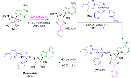 Em uma outra patente, Yihua e colaboradores descrevem a mesma sequência reacional representada no Esquema 22, utilizando a fosforoamida quiral contendo pentafluorfenol 54, e um modo contínuo de operação sob condições microfluídicas em microreatores.52 É sabido que a execução de reações químicas nessas condições se caracteriza como uma alternativa atrativa, quando comparada às condições em batelada e semi-batelada tradicionais, conferindo ao processo, um melhor controle da estequiometria, cinética e troca térmica da reação, além de facilitar o aumento da escala de produção.53 Assim, o rendimento descrito para a etapa de fosforamidação é de até 90,6%, sendo 46 obtido em elevado grau de pureza (até 99,1%), após extração líquido-líquido seguida de lavagem com éter de petróleo e filtração. Benshun e colaboradores também descreveram a etapa de fosforamidação utilizando o derivado nucleosídico protegido com benzaldeído dimetilacetal 56 e a unidade fosforilada p-nitrofenolada 45 (Esquema 23).54 O acoplamento se dá na presença de uma base como DIPEA, N-metilimidazol ou imidazol, em até 82% de rendimento após purificação por coluna cromatográfica. Após hidrólise do grupo protetor de 57 em meio ácido, Remdesivir é obtido em 84% de rendimento. Os autores sugerem que a substituição do grupo envolvido na proteção do sistema 2',3'-diol reduz o risco de formação de subprodutos e melhora o rendimento do processo quando comparado às rotas originais.