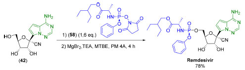 O mesmo grupo descreveu também o acoplamento entre a unidade nucleosídica desprotegida 42 e a porção fosforoamida quiral contendo N-hidroxisuccinimida como grupo de saída 58 na presença de uma base como trimetilamina ou trietilamina e de um ácido de Lewis (óxido ou brometo de magnésio, por exemplo), fornecendo o Remdesivir em rendimento de 78% (Esquema 24).55 Esse método de fosforamidação fornece o antiviral em elevado grau de pureza (> 99%) diretamente após essa etapa, sem a necessidade de purificação por coluna cromatográfica. É importante destacar ainda que, uma vez que o acoplamento envolve o derivado nucleosídico desprotegido, a etapa de clivagem de grupo protetor é eliminada, reduzindo assim etapas adicionais do processo de produção.