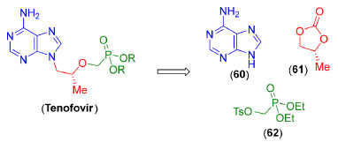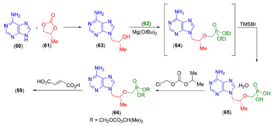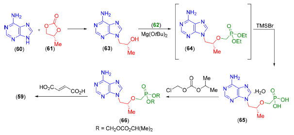 A rota de produção comercial do pró-fármaco 59 consiste em um processo de três estágios e quatro etapas reacionais sequenciais a partir da adenina (60) (Esquema 26).61-63 A instalação do único estereocentro se dá já na primeira etapa, por meio da N-alquilação da adenina com carbonato de (R)-propileno 61. A introdução da ligação fosfonato ao intermediário 63 é realizada usando fosfonato de dietil(tosiloxi)metila (62), via O-alquilação mediada por base, fornecendo o intermediário éster fosfonato 64. A seguir, a hidrólise dos grupamentos ésteres dietil fosfonatos por ação de TMSBr, fornece o hidrato de Tenofovir (65), o qual é então esterificado com cloreto de metilisopropilcarbonato, fornecendo o composto 66. O processo se completa com o tratamento com ácido fumárico, que fornece 59 cristalino em um rendimento global de apenas 13%.