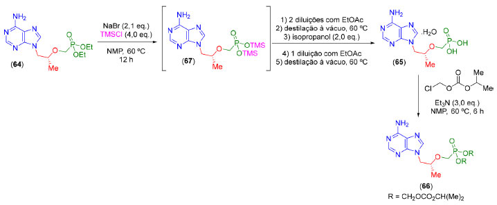 Nessa rota sintética há a necessidade de preparo prévio do carbonato quiral 61, que pode ser obtido em duas etapas adicionais a partir de S-glicidol (rendimento global de 70%)64 ou via fluxo contínuo a partir do glicerol, usando uma abordagem quimio-enzimática, em sete etapas sequenciais e 20% de rendimento global.65 Além disso, na primeira etapa dessa rota observa-se uma perda de seletividade devido à formação de outros regioisômeros N-alquilados.66 Outros pontos carentes de melhoria nesse processo são a substituição do brometo de trimetilsilano (TMSBr), de elevado custo, por outro agente de dealquilação e o melhoramento dos processos de workup e isolamento de intermediários, nos estágios finais da síntese do pró-fármaco 59. Em 2010, Ripin e colaboradores, ao revisitarem a rota sintética, alcançaram aumentos significativos do rendimento global da síntese do composto 59 para 24%62 e, posteriormente, para 31%.67 No primeiro relato, os pesquisadores identificaram que a qualidade da base terc-butóxido de magnésio (Mg(OtBu)2) é crucial na eficiência da etapa de O-alquilação do intermediário 63 e reduziram ainda o custo associado à etapa de desalquilação de 64 ao substituir TMSBr por uma mistura de TMSCl/NaBr. Além disso, para a etapa de esterificação do hidrato de Tenofovir (65), importantes melhorias foram alcançadas, como a adição de brometo de tetrabutilamônio, capaz de atuar como agente de transferência de fase, aumentar a velocidade de reação e estabilizar o produto formado 66, minimizando a formação de impurezas. Um outro ponto importante foi o emprego de ciclo-hexano no processo de extração do produto, reduzindo processos de decomposição. Já na segunda publicação, os autores relataram o desenvolvimento de um procedimento one-pot para a conversão de 64 a 65 (Esquema 27). A hidrólise do éster fosfonato dietílico tem início com a sililação reversível de 64 com TMSCl, gerando o intermediário reativo 67, o qual é então hidrolisado pelo íon brometo proveniente do NaBr. O método utiliza condições brandas, capazes de promover ganhos importantes no tempo (12 horas) e temperatura reacionais (60 °C). Os pesquisadores demonstraram ainda a subsequente alquilação de 65 mediada por cloreto de metilisopropilcarbonato.