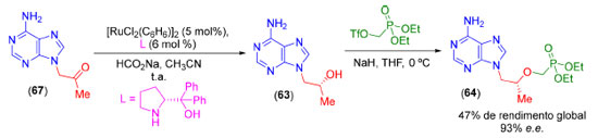 Dentro da mesma perspectiva de melhoramento da rota industrial de produção do pró-farmaco fumarato de Tenofovir desoproxila (59), Edlin e colaboradores reportaram uma série de modificações capazes de elevar o rendimento global da síntese para 23%.68 Foi demonstrado que a substituição de bases de sódio pelas de potássio é benéfica para a etapa de N-alquilação da adenina (60) com o carbonato de (R)-propileno (61). Além disso, a substituição do Mg(OtBu)2, que além de possuir alto custo também necessita um alto grau de pureza e gera subprodutos de difícil isolamento e purificação, pela combinação na razão 1:1 de um reagente de Grignard (PhMgCl ou MeMgCl) e terc-butanol melhora significativamente a etapa de produção do intermediário 64. Em 2014, outro trabalho trouxe inovações importantes no processo de síntese do Tenofovir, utilizando etapa de hidrogenação assimétrica a partir de derivados de purina para geração centro estereogênico (Esquema 28).69 Assim, a proposta foi a primeira a utilizar substratos aquirais como material de partida para preparação do intermediário-chave 63, uma vez que até então todas as alternativas de síntese disponíveis utilizavam de derivados enantiomericamente enriquecidos, como o composto 61. Merece destaque ainda que o protocolo utilizou condições reacionais brandas e forneceu o intermediário éster fosfonato 64 em 97% de e.e. e em 47% de rendimento global. Por outro lado, como principal desvantagem, destaca-se o custo associado dos catalisadores.