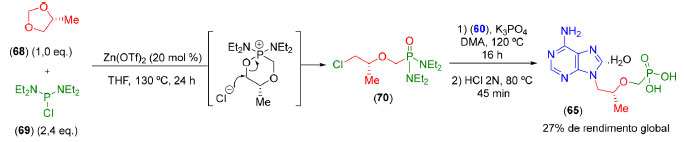 Atualmente, a síntese do intermediário-chave quiral 63 também já foi descrita utilizando catálise enzimática, acessando o composto desejado em até 97% de rendimento e 99% de e.e. ao se utilizar cetoredutases.70 Em 2015, Jamison e colaboradores descreveram a síntese do hidrato de Tenofovir 65 em três etapas, a partir do dioxolano 68 (Esquema 29).71 O protocolo consistiu na preparação da subunidade éter fosfonometílico presente em 70 via acoplamento do dioxolano na presença de bis(dietilamino)clorofosfina (69) e catálise por ácido de Lewis (Zn(OTf)2), seguido de rearranjo. Na sequência, a adenina (60) foi então N-alquilada com 70 na presença de K3PO4 e, após hidrólise ácida, o hidrato do Tenofovir 65 foi obtido em 27% de rendimento global. Além de utilizar condições brandas, materiais de partida acessíveis, e ser uma sequência curta, a metodologia é inovadora nas desconexões e em sua potencial aplicação sintética, uma vez que a subunidade 70 encontra-se presente também nas estruturas de outros antirretrovirais.