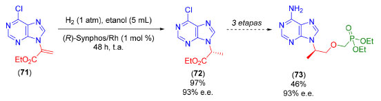 Em 2016, o grupo de pesquisa de Fan desenvolveu e aplicou um novo protocolo de hidrogenação assimétrica da nucleobase α-purínica substituída 71 na síntese de um análogo do intermediário-chave do Tenofovir (73).72 Utilizando uma baixa carga de um catalisador de ródio com o ligante quiral (R)-Synphos, sob condições reacionais brandas, foi possível a obtenção do derivado 72 em excelente rendimento e excesso enantiomérico. Sua posterior conversão no análogo de um intermediário Tenofovir (73) foi ainda demonstrada em duas etapas, em 46% de rendimento e sem perda da enantiosseletividade (Esquema 30).