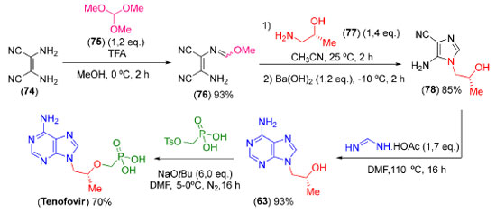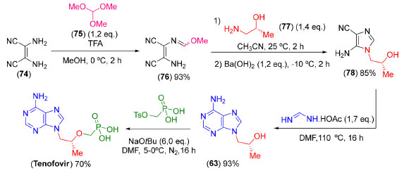 Em 2020, Gupton, McQuade e colaboradores apresentaram uma proposta inovadora de síntese para o Tenofovir (2), utilizando materiais de partida e intermediário-chave bastante distintos das rotas usuais (Esquema 31).60 Inicialmente, a condensação entre diaminomaleonitrila (74) e ortoformato de trimetila (75) forneceu o formimidato 76 em 93% de rendimento. Na sequência, a adição do (R)-1-aminopropan-2-ol (77), levou a um intermediário formamidino que, após ciclização, forneceu o (R)-5-amino-1-(2-hidroxipropil)-1H-imidazol-4-carbonitrila (78) em 85% de rendimento. A seguir, a reação de 78 com acetato de formamidina resultou na formação do núcleo adenina presente em 63 em 93% de rendimento. Finalmente, a introdução da ligação fosfonato para formação de Tenofovir foi realizada pela O-alquilação via ácido tosiloximetil-fosfônico. Esse protocolo de quatro etapas forneceu o antiviral em 51% de rendimento global e tem potencial para escalonamento e realização via fluxo contínuo. Além disso, cabe ressaltar que, comparado ao processo comercial usual, uma melhoria satisfatória apresentada por este protocolo é a realização da O-alquilação de 63 em uma única etapa, em 70% de rendimento, utilizando NaOtBu como base.