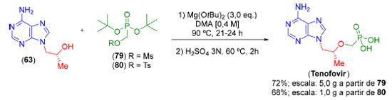 Em 2020, Clososki e colaboradores9 optaram por utilizar a rota sintética otimizada por Ripin62,67 para obter fumarato de Tenofovir desoproxila em escala piloto, monitorando o processo de produção do antiviral por espectroscopia na região do infravermelho (IV). Estudos de degradação acelerada desse fármaco levaram ainda os pesquisadores a identificar um novo possível produto de degradação. Merece destaque que os autores reportaram a primeira investigação in vitro do Tenofovir frente à linhagens de SARS-CoV-2. Recentemente, Opatz e colaboradores concentraram seus esforços na síntese dos fosfonatos de di-terc-butila 79 e 80 e na sua aplicação na síntese do Tenofovir, a partir do substrato 63, em uma sequência de duas etapas (Esquema 32).73 Primeiramente, as condições reacionais da alquilação do intermediário-chave 63 com o fosfonato na presença de Mg(OtBu)2 foram otimizadas, seguida de uma hidrólise ácida. Como vantagens, destaca-se que novos fosfonatos podem ser obtidos em larga escala e não necessitam de purificação por cromatografia. Adicionalmente, o emprego do derivado mesilado 79 conferiu uma maior economia atômica ao processo e forneceu o Tenofovir em 72% de rendimento numa reação conduzida numa escala de 5 g de 63.