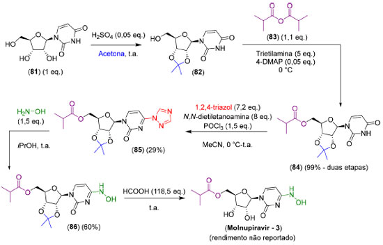 MOLNUPIRAVIR (EIDD-2801) O Molnupiravir, também denominado de EIDD-2801 ou MK-4482, é uma das substâncias com potencial para o tratamento da COVID-19 desenvolvida pelo Instituto Emory para o desenvolvimento de medicamentos (Emory Institute for Drug Development).74-76 Essa substância é um pró-fármaco do EIDD-1931 que, apesar de manifestar uma boa atividade antiviral, não apresentou uma boa biodistribuição em macacos.77 O EIDD-2801 apresenta uma estrutura química mais simples que a do Remdesivir e ainda tem a vantagem de poder ser administrado pela via oral. Devido ao grande potencial dessa substância, recentemente, muitas propostas metodológicas de síntese vêm sendo desenvolvidas visando obtê-lo de maneira eficiente e acessível. Painter e colaboradores publicaram, em 2019 pela Emory University, duas patentes reivindicando uma metodologia para síntese total do Molnupiravir.78,79 Essa proposta foi descrita em cinco etapas partindo da uridina (81) e apresentou rendimento global inferior a 17% (Esquema 33). A metodologia se iniciou com a proteção das hidroxilas secundárias da uridina com acetona em meio ácido, formando o intermediário 82. Em seguida, ocorreu a acilação deste intermediário com o anidrido isobutírico (83) catalisado por 4-DMAP na presença de trietilamina, levando ao intermediário 84 em 99% de rendimento. Na sequência, esse derivado foi então tratado com 1,2,4-triazol em meio básico na presença de POCl3 formando o intermediário 85 (29% de rendimento). Finalmente, 85 sofre uma adição de hidroxilamina seguida da eliminação do triazol formando o intermediário 86 em 60% de rendimento, que após um tratamento ácido para desproteção das hidroxilas secundárias, leva ao Molnupiravir (3).