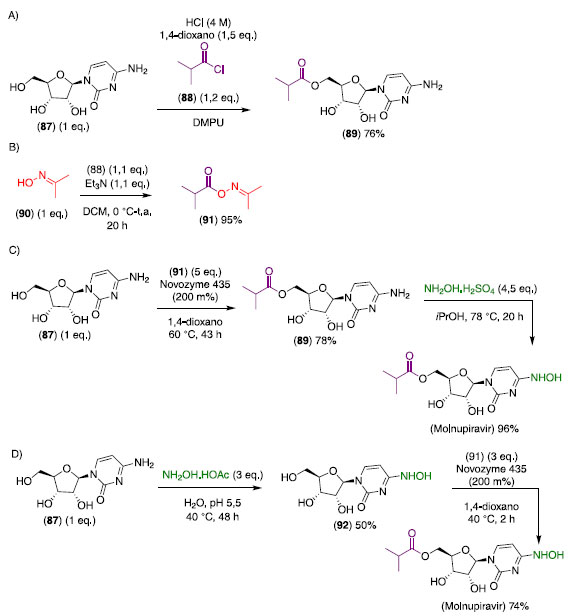 ![]() Esquema 34. A) Acilação química da citidina; B) Síntese do doador de grupo acila 91; C) Síntese do Molnupiravir em duas etapas (acilação/transaminação); D) Síntese do Molnupiravir em duas etapas (transaminação/acilação)