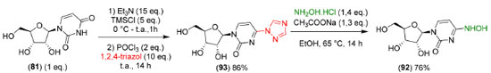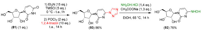 Os autores ainda sugeriram a obtenção do intermediário 92 a partir da uridina (Esquema 35). Nessa proposta, a uridina foi tratada com trietilamina na presença de TMSCl, seguida da reação com POCl3 e 1,2,4-triazol, fornecendo o intermediário 93 em 86% de rendimento. O intermediário foi então tratado com cloridrato de hidroxilamina na presença de acetato de sódio e forneceu o produto desejado 92 em 76% de rendimento e 48% de rendimento global.