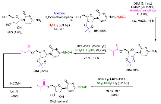 Recentemente, o grupo de Snead publicou uma nova rota de síntese partindo da citidina e minimizando algumas das desvantagens sintéticas da proposta de síntese anterior, como necessidade de uso de excesso do agente de acilação e o alto custo associado à enzima suportada.81 Inicialmente, os autores propuseram a proteção das hidroxilas secundárias da citidina com um acetonídeo de maneira a diminuir a probabilidade de O-acilação e facilitar a separação da fase aquosa durante o processo de síntese (Esquema 36). Essa reação ocorreu na presença de acetona catalisada por ácido sulfúrico e forneceu o sal de sulfato do acetonídeo 94 em 98% de rendimento, separado por precipitação diretamente do bruto reacional. Na sequência, a acilação foi realizada na presença de anidrido isobutírico catalisado por DMA e DBU fornecendo o intermediário 95 em 78% de rendimento. A reação de transaminação com hidroxilamina ocorreu de maneira a conservar o grupo isobutilester e formar o produto desejado 86 em 96% de rendimento, seguido da desproteção do acetonídeo (60% de rendimento). Uma alternativa demonstrada foi a realização dessas duas últimas etapas via one-pot, contudo foi observado a formação de 20% de N-hidroxicitidina como subproduto. Nesse sentido, tanto a rota de duas etapas como a rota em um único frasco reacional para a acilação forneceram rendimentos globais bastante similares, 44 e 41% respectivamente.