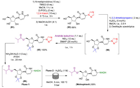 Em 2020, Kappe e colaboradores demonstraram alterações na metodologia original de síntese do Molnupiravir e obtiveram um rendimento global de 61% partindo da uridina (Esquema 37).82 A síntese se iniciou pela etapa de triazolação que foi realizada na presença da base N-metilpirrolidina, além da proteção com TMSCl que foi retirado de maneira one-pot fornecendo o produto 93 em 88% de rendimento por precipitação. Na etapa subsequente, observou-se que a necessidade de uso de um excesso de anidrido isobutírico estava relacionada a reações laterais com metanol (formado como subproduto da reação com 2,2-dimetóxipropano). Assim, ao realizar uma destilação azeotrópica para a remoção do metanol foi possível utilizar apenas 1,1 equivalentes de anidrido isobutírico, levando ao intermediário 85 de maneira quantitativa. A etapa seguinte foi realizada em um sistema de fluxo contínuo, no qual o bruto da reação de 85 com a hidroxilamina foi inserido no reator. Foi necessário adicionar metanol para evitar a formação de precipitados dentro do reator, levando a um rendimento de 69%.