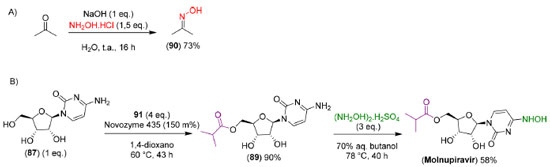 Em 2021, Jamison, Snead e colaboradores revisitaram a proposta de síntese a partir da citidina80 e refinaram parâmetros de maneira a possibilitar uma escala sintética de decagramas (Esquema 38).83 Com essa estratégia, foi possível obter um rendimento global de 41%, sem a necessidade de purificações por cromatografia em coluna. A estratégia foi desenvolver uma metodologia de síntese acessível para a obtenção da oxima 90 a partir da acetona e cloridrato de hidroxilamina, fornecendo o intermediário desejado em 73% de rendimento e em uma escala de 500 g. A etapa de acilação foi então conduzida numa escala de 200 g, fornecendo o produto 89 em 90% de rendimento. Uma observação importante consistiu na possibilidade de reuso da enzima, reduzindo os custos associados a essa reação. Na etapa de transaminação (realizada a partir de 80 g de 89), substituiu-se a solução de isopropanol por uma solução de 1-butanol e diminuiu-se a equivalência do sal de hidroxilamina (3 eq.) com o objetivo facilitar a purificação. A etapa de purificação foi então realizada através de extrações líquido-líquido, seguida de recristalização, levando ao Molnupiravir em 58% de rendimento.
