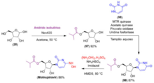 Recentemente, Fier e colaboradores descreveram uma metodologia de síntese em três etapas para a obtenção do Molnupiravir com 69% de rendimento global partindo da ribose.84 A ribose 28 é um material de partida mais simples do que a citidina e uridina já reportados para essa síntese. A proposta envolve etapas sucessivas empregando biocatálise, seguida de uma etapa final de formação da oxima (Esquema 39). A síntese se inicia pela acilação seletiva da hidroxila 5' da ribose com anidrido isobutírico na presença da enzima Nov435, seguida da fosforilação da hidroxila 1' com o auxílio da enzima MTR quinase e a substituição da uracila pela uridina fosforilase. Nessa reação as enzimas acetato quinase e piruvato oxidase atuam reciclando o ATP e evitando o acumulo de fósforo inorgânico que poderia deslocar o equilíbrio em direção a uracila livre. Finalmente a conversão da carbonila na oxima foi realizada através da reação de 99 com hidroxilamina, na presença de imidazol e hexametildisilazano (HMDS). O grupo TMS foi importante para facilitar o processo de purificação dos sais inorgânicos e foi facilmente retirado do sistema após ajuste do pH, fornecendo o EIDD-2801 em ótimo rendimento. Ressalta-se que essa estratégia de síntese mostrou-se bastante seletiva e forneceu altos rendimentos partindo de substratos bastante simples e acessíveis.