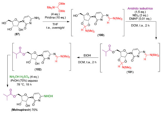 Em 2021, uma proposta sintética one-pot foi descrita partindo da citidina como material de partida, com 70% de rendimento global (Esquema 41).49 A proposta iniciou com a utilização de N,N-dimetilformamida dimetil acetal (50) como grupo protetor do nitrogênio e das hidroxilas secundárias, levando ao intermediário 100. Após remoção do solvente, adicionou-se ao bruto reacional anidrido isobutírico, na presença de trietilamina e de DMAP catalítico, utilizando-se diclorometano como solvente. Na sequência, adicionou-se etanol à reação contendo o intermediário 101, resultando na formação de 102. Finalmente, uma nova remoção do solvente, seguida da adição de isopropanol e hidroxilamina levou à formação do molnupiravir em 70% de rendimento global. Essa metodologia é bastante inovadora por se tratar de uma metodologia via one-pot e que dispensa o uso de purificações por cromatografia em coluna.