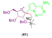 Em 2012, Kim e colaboradores publicaram uma nova alternativa para preparo do composto 40 empregando como ácidos de Lewis o TMSOTf e o BF3-Et2O.35 No geral, foi verificado que o uso de baixas temperaturas (-78 °C) leva a uma seletividade para o anômero β (Tabela 2 - entradas 4 e 5). A formação do complexo 41 (Figura 2) foi proposto como responsável por levar à formação majoritária do produto β, devido à coordenação do silício ao oxigênio favorecer o ataque nucleofílico à face Si da carbonila.