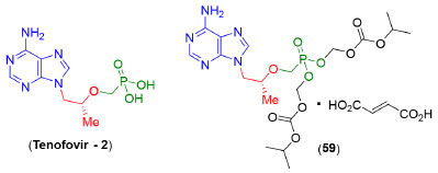 TENOFOVIR O análogo de nucleosídeo Tenofovir (2), comercializado na forma do pró-fármaco fumarato de Tenofovir desoproxila (59), é um antiviral amplamente utilizado como um inibidor da transcriptase reversa do vírus da imunodeficiência humana (HIV), tendo sido projetado para melhorar a absorção e a permeabilidade celular (Figura 3).1 Esse fármaco, também empregado para o tratamento da hepatite B, pertence à classe dos fosfonatos de aciclonucleosídeos e é comercializado como Viread® pela Gilead Sciences.2 Recentemente ele tem sido amplamente investigado como possível alternativa para o tratamento da Covid-19.8,9,56-58