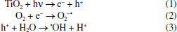 RESULTS AND DISCUSSION Photocatalytic of TiO2 TiO2 has been recognized as a photocatalyst in demand since the early 1970s.22 Starting with the conversion of photoelectrochemical solar energy to other areas, such as environmental photocatalysis, hydrophilicity, self-cleaning, antifogging, and most recently as antimicrobials.23 As a semiconductor, TiO2 absorbs photons of sufficient energy to excite electrons (e-) from the valence to the conduction band, and consequently, leaves a positively charged hole (h+) in the valence band, as seen in Equation 1. Figure 1 shows the photocatalytic mechanism of TiO2.24 The bandgap energy of the anatase phase is about 3.2 eV. This indicates photocatalysis is activated by photons of wavelengths lower than 385 nm (UVA). The electrons and holes then recombine, or migrate to the surface before reacting, to produce reactive oxygen species (ROS), including O2- (2) and ∙OH (3).25 Furthermore, radical reactions with organic compounds lead to mineralization,20 while membrane lipids are facilitated by microbes,21 and this recombination lowers process' efficiency. Research has developed composites as a method of reducing recombination.25 ![]()