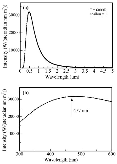 ![]() Figure 2. The intensity of sunlight (6,000 K) using the blackbody radiation equation (a) 0-0.5 µm, (b) 0.3-0.6 µm