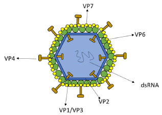 TiO2 treatment to degrade rotavirus has shown that the product of reactive oxygen species (ROS), interacts with the viral protein membrane in the process of inactivation.66 Rotavirus is a three-layered particle containing 11 segments of double-stranded RNA (ds) as its genome. RNA segments encode 6 structural (VP1-VP4, VP6, VP7) and 5-6 non-structural proteins (NSP1-NSP5/6).84 Figure 6 shows the schematic structure of rotavirus.