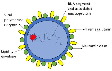Sang et al.66 carried out a study on TiO2 activation using white fluorescent lamps. The ROSs, including hydroxyl radicals (·OH) and superoxide anions (·O2-), were produced in significant quantity after stimulation had been carried out for 8, 16, and 24 hours. The inactivation of astrovirus, rotavirus, and FCV in the presence of TiO2 films under visible light, showed their performance and mechanism. Other studies have explained that titanium dioxide destroys influenza viruses after 30 min of incubation. However, does not explain the effects of oxygen radicals virologically. This shows TiO2's ability to inactivate influenza viruses, is dependent on the incubation period and the nanoparticles concentration.76,85 Figure 7 illustrates the influenza virus' structure.