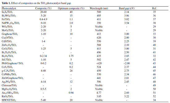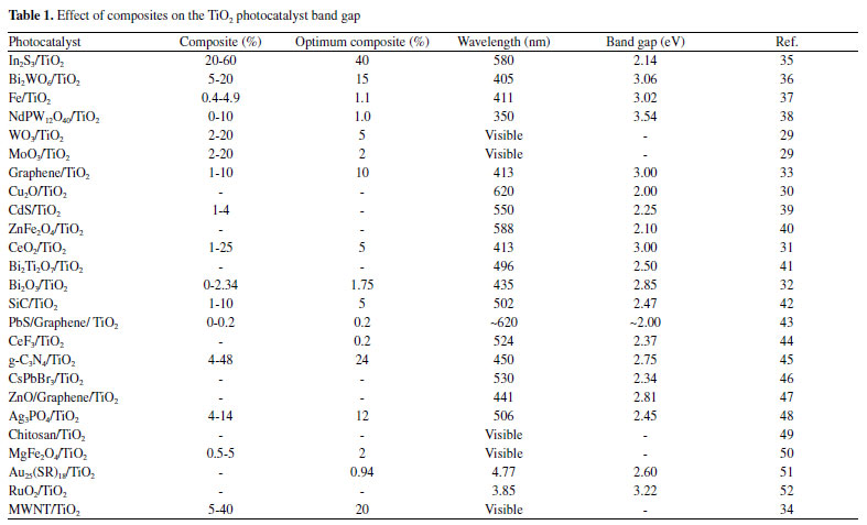 Several studies have developed TiO2 to work on visible light, one of which is a composite. In addition to reducing the band gap, composites are also able to trap charges, thus, lowering the electron-hole rate of recombination. Figure 3 illustrates the effect of the composite on TiO2's band gap. Several factors, including the composite type, concentration, and production technique, as well as the catalyst's physico-chemical properties, regulate the influence of photocatalytic activity on composites.26 Table 1 shows the effect of composites on the bandgap of TiO2 photocatalysts from various photocatalytic applications. Metal oxide is a material often used as a composite for photocatalysis. Bai et al.29 composited TiO2 with WO3 and MoO3 with different compositions using the sol-gel method.