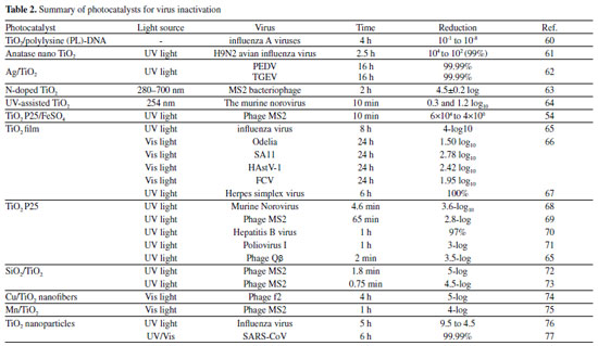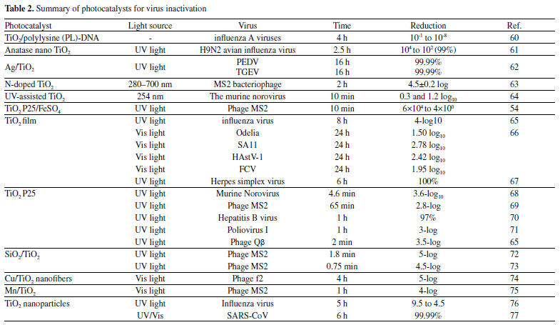 The results showed the composites of 5 wt% WO3/TiO2 and 2 wt% MoO3/TiO2 degraded RhB optimally, under visible light. These conditions indicated a 5 wt% WO3 and a 500°C calcination temperature for WO3/TiO2, while a 2 wt% MoO3, and a calcination temperature of 300 °C, were denoted for the MoO3/TiO2 composites. The high photocatalytic activity obtained is as a result of the efficient separation of charge carriers. Thus, composites containing efficient metal oxides are potential options for notably increasing TiO2's photocatalytic activity, in the presence of visible light. Another composite (Cu2O) was also reported by Jiang et al.30 to reduce the band gap to 2.00 eV. Cu2O/TiO2 composites were created without templates or additives, through an unsophisticated hydrothermal method, by reacting Cu(CH3COO)2·H2O, with (NH4)2TiF6. Therefore, the photo-degradation potential of methylene blue (MB) solution under visible light is evaluated to estimate the photocatalytic activity. In contrast with pure TiO2, the composite's UV-Vis absorption spectra demonstrated a redshift within the band-gap transition. This property was observed between the visible region and absorption edge and attributed to the Cu2O content. Furthermore, the research of Munoz-Batista et al.31 used CeO2 as a composite of TiO2, which was obtained by the microemulsion method followed by calcination. Using this sample as a photocatalyst, mineralization of toluene and the inactivation of Escherichia coli 1337-H were carried out under UV and visible illumination conditions. Liu et al.32 investigated the effect of Bi2O3 composites on TiO2. Bi2O3/TiO2 photocatalysts, which was prepared using the sol-gel method without water through various Bi-Ti atomic ratios and calcination temperatures. The results showed that the Bi2O3/TiO2 photocatalyst with a 1.75% Bi-Ti proportion exhibited the best performance during methyl orange (MO) degradation. Furthermore, the photocatalytic degradation rate of MO reduced gradually with increasing calcination from 420-620°C. Other advantages of the Bi2O3 composite are the effective suppression of the anatase phase transformation to rutile, prevent crystal overgrowth, and increase the absorption of visible light compared to the pure TiO2. In other studies, carbon compounds have also been used in photocatalytic composites. Khalid et al.33 used graphene as a TiO2 composite. This material was synthesized through hydrothermal techniques, and the results indicated a shift in the TiO2 absorption edge towards the visible light region, following a consequent increase in the total graphene present. In addition, efficient methyl orange (MO) photodegradation was observed with the graphene/TiO2 composites, and this was greater in the presence of visible light, compared to pure TiO2 samples. This is due to the extended range of light absorption, significant absorbency of dye, and the efficient charge separation as a result of the planar two-dimensional structure of graphene. Wang et al.,34 composited multi-walled carbon nanotubes (MWNT) with a TiO2 composite catalyst, produced using a modified sol-gel technique, for phenol degradation. The results indicated increasing the MWNT/TiO2 ratio from 5 to 20% supports an increased synergistic effect on phenol loss, which is correlated with changes in the UV-vis solid spectrum. Inactivation of viruses by photocatalyst of TiO2 Photocatalysis inactivate a wide variety of organisms including bacteria, endospores, fungi, algae, protozoa, viruses, and prions.21 Waterborne viruses such as phage MS2, bacteriophage, and phage f2 are disinfected using TiO2 photocatalysts, resulting to 1.8-log to 6-log in a time span of 2 to 180 min.15,53-55 Airborne viruses produced in 4-log disinfection efficiency, until they are eliminated in a susceptible short irrigation time up to 7 min.56,57 Foodborne viruses, such as MNV-1 resulted in a 3.2-log to> 5.5-log disinfection efficiency in the range of 109 to 160 min.58,59 There was a positive response to virus reduction based on the disinfection efficiency, which is influenced by the radicals generated based on the band gap size of the photocatalyst. Some examples of different viral inactivation using photocatalysts are shown in Table 2.