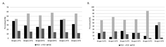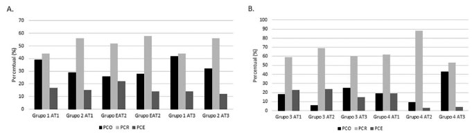 ![]() Figura 1. Porcentagem de uso dos processamentos cognitivos durante a resolução das três atividades cooperativas nos Grupo 1 e 2 (a) e das três atividades colaborativas nos Grupos 3 e 4 (b), AT1 = primeira atividade, AT2 = segunda atividade, AT3 = terceira atividade e EAT = atividade desenvolvida pelo grupo de especialistas