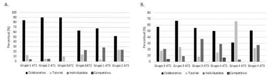 ![]() Figura 2. Porcentagem de uso dos processamentos sociais durante a resolução das três atividades dos Grupos 1 e 2 cooperativos (a) e das três atividades dos Grupos 3 e 4 colaborativos (b), AT1 = primeira atividade, AT2 = segunda atividade, AT3 = terceira atividade e EAT = atividade desenolvida pelo grupo de especialistas