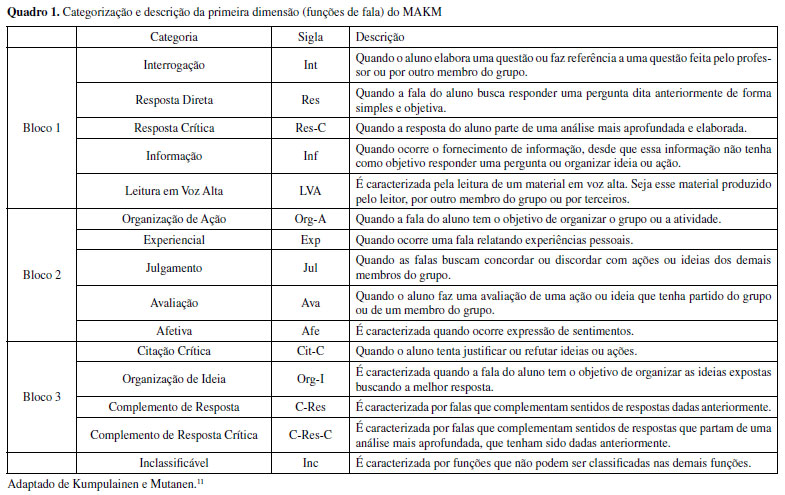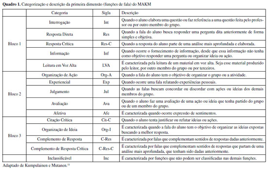 MODELO ANALÍTICO DE KUMPULAINEN E MUTANEN11 O MAKM tem como objetivo principal investigar a natureza das atividades sociais dos alunos, em especial as interações verbais realizadas em diferentes situações de aprendizagem. No entanto, o Modelo não se restringe apenas a tais interações, também permite que se entenda a construção do conhecimento, valorizando o caráter da atividade, momento a momento, tendo como foco de análise o aluno e o grupo. Para tanto, descreve a dinâmica das interações estabelecidas entre os membros do grupo, envolvendo três dimensões: funções da fala, processamento cognitivo e processamento social. Primeira dimensão: funções de fala No que diz respeito à primeira dimensão, são investigadas as estratégias comunicativas adotadas pelos alunos enquanto interagem com os colegas, buscando determinar quais são os significados funcionais das suas falas. Funções de fala podem refletir as expectativas dos alunos frente ao contexto sociocultural da atividade didática proposta pelo professor e permitem interpretar a evolução da situação criada pela atividade. A identificação das funções de fala está relacionada com a base do que o orador fala, ou seja, aquilo que sua fala pode implicar ou sugerir. Algumas dessas funções descrevem a natureza da interação com ênfase nas demandas exigidas pela tarefa, enquanto outras enfatizam a perspectiva social ou cognitiva das interações em grupo. Com o intuito de facilitar a análise das interações discursivas na perspectiva das funções de fala, elas foram distribuídas em três blocos. O primeiro bloco é composto pelas funções de fala dos seguintes tipos: interrogação (Int), resposta (Res), complemento de resposta (C-Res), informação (Inf) e leitura em voz alta (LVA). Essas funções foram agrupadas por serem capazes de refletir as interações entre os alunos na busca direta e objetiva pela resolução da atividade proposta pelos professores. O segundo bloco é composto pelas funções de fala dos seguintes tipos: organização de ação (Org-A), experiencial (Exp), julgamento (Jul), avaliação (Ava) e afetiva (Afe). Essas funções foram agrupadas por serem capazes de refletir as interações ocorridas entre os interlocutores na perspectiva de interação social. Elas são, entre as demais, as que melhor refletem a interação social ocorrida entre os alunos. É com elas que eles julgam, avaliam, organizam e até elogiam seus pares. Por fim, o terceiro bloco é composto pelas funções de fala dos seguintes tipos: resposta crítica (Res-C), complemento de resposta crítica (C-Res-C), citação crítica (Cit-C) e organização de ideia (Org-I). Essas funções foram agrupadas por serem capazes de refletir as interações entre os alunos baseadas em exercício crítico-reflexivo com demanda cognitiva complexa. O Quadro 1 ilustra as funções de falas, adaptadas para a nossa análise, a partir do MAKM.
