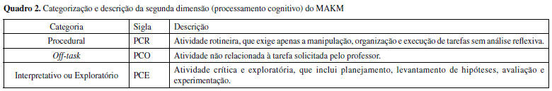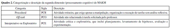 Segunda dimensão: processamento cognitivo No que diz respeito à segunda dimensão, são investigadas as estratégias adotadas pelos alunos, do ponto de vista cognitivo, na resolução da tarefa solicitada pelo professor, as quais podem ser categorizadas conforme ilustra o Quadro 2.