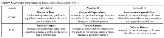 PERCURSO METODOLÓGICO Contexto de aplicação da proposta A atividade cooperativa (jigsaw) e a colaborativa (PLTL) sobre equilíbrio químico foram levadas a cabo em horário extraclasse na disciplina Introdução à Química, oferecida aos alunos ingressantes do Curso de Bacharelado em Química do Instituto de Química de São Carlos da Universidade de São Paulo (IQSC/USP). A disciplina, de caráter obrigatório, é ministrada em quatro horas semanais e visa à discussão e o fornecimento ao aluno de uma fundamentação teórica geral da química, demonstrando a lógica do aprendizado e enfocando tanto aspectos fenomenológicos, quanto aplicações do dia a dia relacionadas aos conteúdos abordados. No primeiro dia de aula a disciplina contava com sessenta alunos matriculados, não ocorrendo nenhuma adição ou desistência, e esse número se manteve até o final do semestre, com os alunos divididos em duas turmas de forma igualitária, cada uma com seu respectivo docente. Participaram, inicialmente, das atividades didáticas, realizadas em período extraclasse, 34 alunos, sendo dezessete alunos provenientes de cada turma. Os alunos foram divididos em sete grupos, cinco grupos heterogêneos de cinco membros, isso é, formados por integrantes com diferentes perfis, níveis de motivação e conhecimento prévio para realizar a atividade proposta (formato jigsaw) e dois grupos não heterogêneos de cinco e quatro membros (formato PLTL). Dos 34 alunos participantes, 23 cumpriram todas as etapas e foram tomados como sujeitos na investigação das interações discursivas estabelecidas nos grupos cooperativos jigsaw e nos grupos colaborativos PLTL. As atividades, formato jigsaw e PLTL, foram executadas em três etapas. Para ambos os formatos, a primeira etapa diz respeito à formação dos grupos e a segunda à vinculação da atividade extraclasse com as aulas regulares da disciplina, enquanto a última corresponde à descrição das atividades em grupo, todas realizadas no intervalo de, aproximadamente, uma hora, em três ocasiões. Cada etapa é descrita a seguir, para ambos os formatos. Etapa 1: Formação de grupos Formato Jigsaw: grupos heterogêneos foram formados com base na aplicação de um questionário de caracterização preenchido pelos alunos com informações sobre a sua formação estudantil e em respostas elaboradas por eles na resolução de questões sobre conteúdos de química adaptadas do trabalho de França, Marcondes e Carmo.12 Formato PLTL: grupos não heterogêneos foram formados, uma vez que a heterogeneidade não é uma prerrogativa nesta metodologia. Porém, outras exigências foram consideradas para tanto, conforme mencionado anteriormente: a integração da atividade com as atividades regulares da disciplina e com o conteúdo e a presença do chamado líder-par.10 A integração ocorreu por meio da participação dos docentes responsáveis pela disciplina nas atividades do grupo, no que diz respeito ao planejamento e desenvolvimento das ações didáticas e dos materiais utilizados. O papel de líder-par foi assumido por um aluno de pós-graduação, voluntário da pesquisa e segundo autor do presente manuscrito, que já cursou a disciplina e tem amplo conhecimento do conteúdo ministrado. O seu papel consiste em facilitar o aprendizado dos membros do grupo, a partir do estímulo ao seu engajamento com os demais membros e com o material em estudo, e não em responder perguntas colocadas por eles. Etapa 2: Aulas regulares da disciplina Formato Jigsaw e PLTL: no primeiro dia de aula, os docentes, em cada uma das suas respectivas turmas, apresentaram a disciplina, informando o conteúdo a ser ministrado e principais objetivos. Em seguida, os alunos entraram em contato com a proposta aqui descrita, de caráter não obrigatório, e aqueles que concordaram em dela participar assinaram Termo de Consentimento Livre e Esclarecido (TCLE). No decorrer do semestre, os conteúdos ministrados nas aulas expositivas eram retomados e discutidos nos grupos cooperativos e colaborativos. Etapa 3: Atividades no formato jigsaw e PLTL (extraclasse) As atividades em grupo foram realizadas, conforme mencionado, em horário extraclasse, em três ocasiões, e foram denominadas de Atividade I, Atividade II e Atividade III. O Quadro 3 sumariza cada uma delas, nos respectivos formatos (jigsaw e PLTL), que são descritos sucintamente, a seguir.