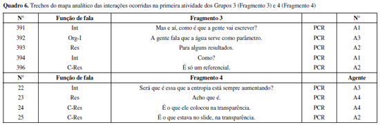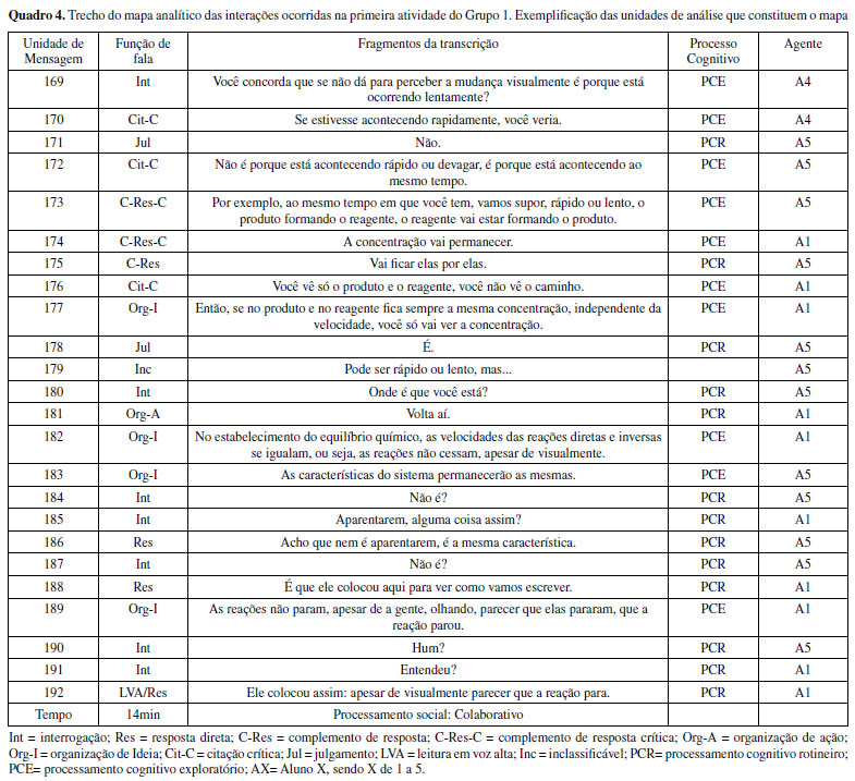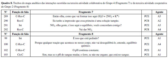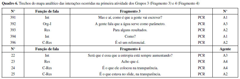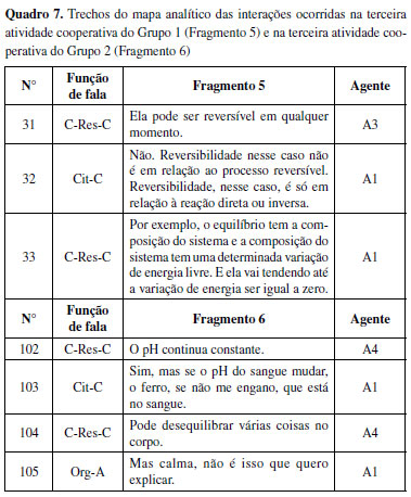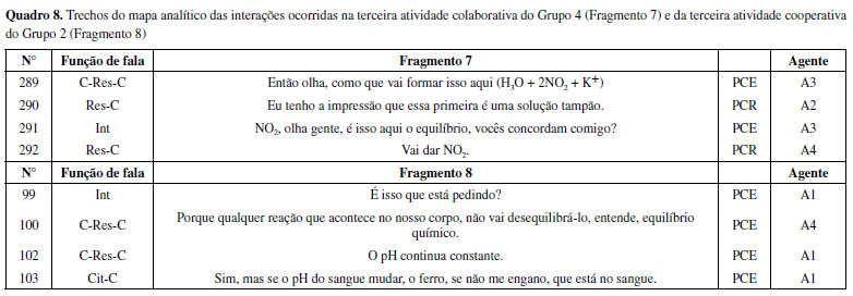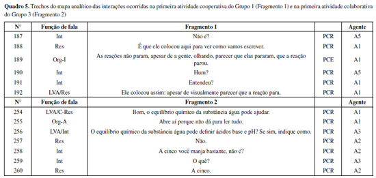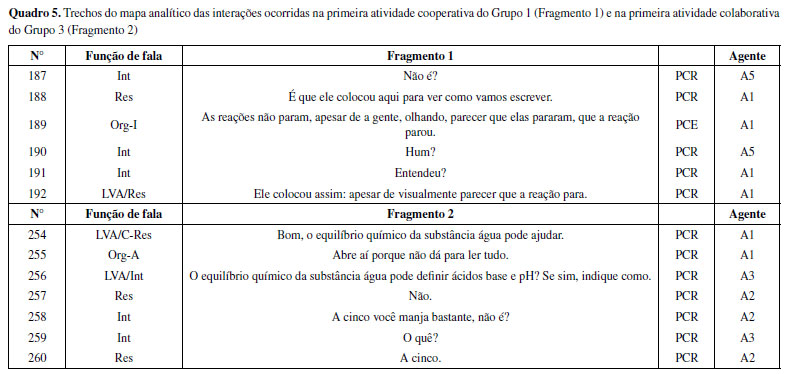 Para as funções de fala que compõem o primeiro bloco (interrogação, resposta, complemento de resposta, informação e leitura em voz alta), encontramos somatória com valores entre 37,8% e 52,2% para os dois grupos cooperativos e encontramos somatórias com valores entre 47,7% e 52,6% para os dois grupos colaborativos. Observa-se que os grupos colaborativos, em média, apresentaram somatórias superiores às apresentadas pelos grupos cooperativos. De fato, das quatro maiores porcentagens de ocorrência no que diz respeito às funções do primeiro bloco, três foram localizadas nas atividades colaborativas (51,4%; 51,9% e 52,6%), enquanto o maior valor encontrado para os grupos cooperativos foi de 52,2%. Apesar das diferenças encontradas, os valores, de uma forma geral, foram significativos para os quatro grupos, o que indica que os alunos se mantiveram dedicados à resolução das atividades nos grupos cooperativos e colaborativos. Dessa forma, o resultado mostra que as diferentes estruturas não afetaram o comprometimento dos alunos frente à atividade. Algumas peculiaridades, no entanto, distinguem as interações estabelecidas em cada uma das estratégias. Conforme ilustra a Tabela 1, os grupos cooperativos e os grupos colaborativos fizeram uso similar das funções de fala dos tipos interrogação, resposta direta e leitura em voz alta. Para as funções de interrogação, encontramos valores entre 17,1% e 22,3% para os grupos cooperativos e valores entre 15,5% e 26,4% para os grupos colaborativos. Para as funções de resposta direta encontramos valores entre 8,9% e 14,3% para os grupos cooperativos e valores entre 7,4% e 13,1% para os grupos colaborativos. Já para a função de fala leitura em voz alta, encontramos valores entre 3,0% e 5,5% para cinco das seis atividades dos grupos cooperativos, sendo que apenas a atividade do grupo de especialistas apresentou um valor relativamente menor do que as demais (1,1%), e valores entre 2,0% e 5,9% para os grupos colaborativos. Os valores citados revelam que ambas as estratégias geraram atividades com caráter objetivo, nas quais os alunos apresentaram uma postura de busca à resolução da atividade e usaram as referidas funções para conduzir suas ações. O Quadro 5 apresenta trechos do mapa analítico da primeira atividade cooperativa do Grupo 1 e da primeira atividade colaborativa do Grupo 3. Nele são apresentados os fragmentos que evidenciam a forma como as funções de fala interrogação resposta e leitura em voz alta são utilizadas nos dois formatos (jigsaw e PLTL).