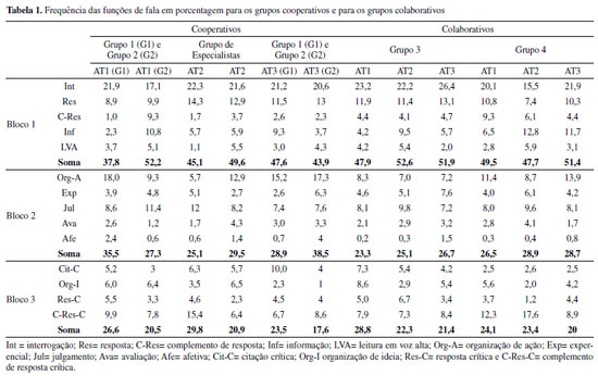 RESULTADOS E DISCUSSÃO As interações discursivas estabelecidas nos grupos cooperativos e colaborativos foram analisadas com base nas três dimensões mencionadas, conforme exposto a seguir. Análise da primeira dimensão: funções de fala A Tabela 1 ilustra a frequência, extraída dos dados obtidos a partir dos mapas analíticos, expressa em porcentagem, em que cada função de fala foi utilizada nos grupos cooperativos jigsaw e nos grupos colaborativos PLTL. Nele constam os dados obtidos para o Grupo 1 e para o Grupo 2 nas três atividades cooperativas (primeira e terceira atividades realizadas nos grupos de base, AT1 e AT3, e segunda atividade no grupo de especialistas, AT2) e para o Grupo 3 e para o Grupo 4 nas três atividades colaborativas (AT1, AT2 e AT3).