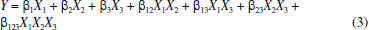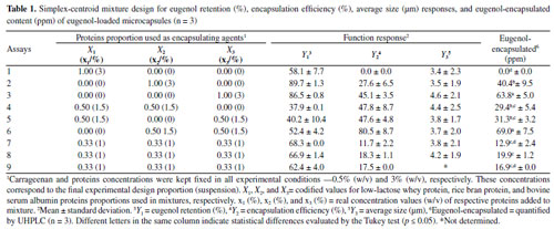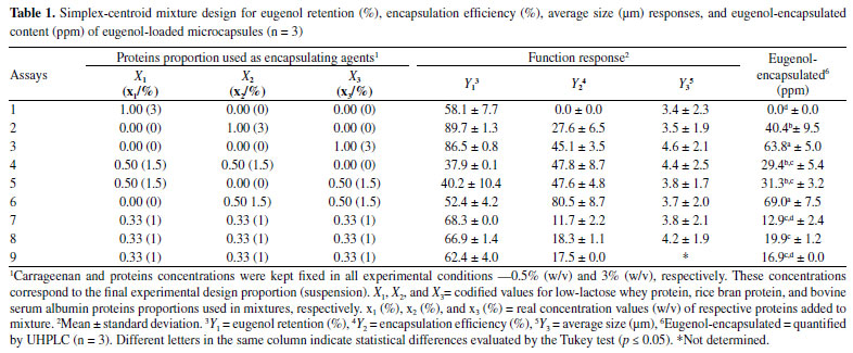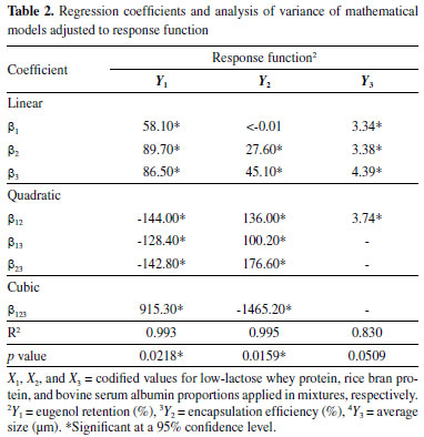 RESULTS AND DISCUSSION Eugenol-loaded microcapsules optimization Table 1 shows the simplex-centroid mixture design responses for eugenol retention (Y1), encapsulation efficiency (Y2), and average microcapsules size (Y3). Eugenol retention results ranged from 37.9 ± 0.1% to 89.7 ± 1.3% and for encapsulation efficiency from 0.0 ± 0.0% to 80.5 ± 8.7%, showing they were significantly influenced by wall materials contents. The average microcapsules size ranged from 3.4 ± 2.3 µm to 4.6 ± 2.1 µm. Similar results were reported by Edris et al.31 (4.37 µm) and Chatterjee & Bhattacharjee1 (1 to 15 µm), who respectively studied the Nigella sativa L. (black cumin) essential oil and eugenol-rich clove extracts microencapsulation, in gum Arabic and maltodextrin mixture. Locali Pereira, Gonçalves Cattelan & Nicoletti32 when microencapsulated pink pepper essential oil in pectin, soy protein isolate, and maltodextrin by spray drying, obtained values between 4.19 and 5.92 µm, similar to those found in this study. These microcapsules size variability is typical from the spray drying process. Eugenol retention (Y1), encapsulation efficiency (Y2), average microcapsules size (Y3), and their respective regression coefficients and mathematical variance analysis models were obtained (Table 2). The mathematical models for Y1 and Y2 showed significant linear, quadratic, and cubical effects at a 95% significance level, and due to theY3 model, the results observed for the cubic model did not show any significant effects (p > 0.05). Cubic models for a three-component-mixture have linear terms related to the additive model, quadratic terms representing binary interactions, and cubic terms that are related to the ternary interaction effect. The design generally performed to determine the model's coefficient values is named simplex-centroid or special cubic model. Therefore, the linear, quadratic, and cubic terms are usual for simplex-centroid mixture design and thus, have been determined.33