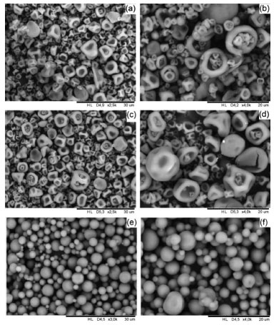 ![]() Figure 2. Eugenol-loaded microcapsules SEM images of carrageenan combined with rice bran protein (a, b); bovine serum albumin (c, d); and rice bran protein and bovine serum albumin binary mixture (e, f) produced by spray-drying. 2500x (left) and 4000x (right) magnification
