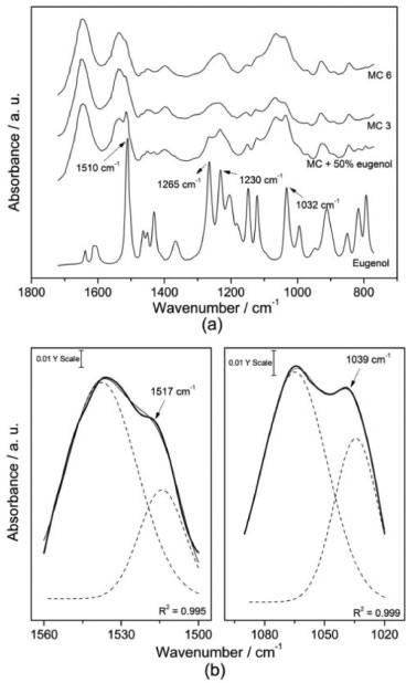 ![]() Figure 3. FTIR-ATR spectrum of (a) eugenol-loaded microcapsules assay 6 (MC 6), assay 3 (MC 3), eugenol-loaded-microcapsules assay 6 added with 50% pure eugenol (w/w) (MC + 50 % eugenol), and pure eugenol; FTIR-ATR deconvolution spectrum of (b) eugenol microencapsulated in carrageenan, rice bran protein and bovine serum albumin (MC 6) in a wavenumber ranging from 1560 to 1500 cm-1 (left) and from 1090 to 1020 cm-1 (right) showing eugenol bands presence at 1517 cm-1 and 1039 cm-1. Original FTIR-ATR spectrum (thick solid line); Gaussian curve-fit (solid line); Peaks from deconvolution analysis (dashed lines)