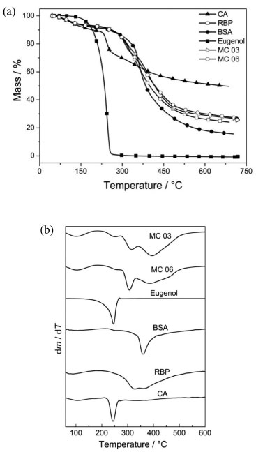 ![]() Figure 4. TG (a) and DTG (b) analyses of eugenol microencapsulated in carrageenan and bovine serum albumin (MC 3), eugenol microencapsulated in carrageenan, rice bran protein, and bovine serum albumin (MC 6), and the pure materials - carrageenan (CA), rice bran protein (RBP), bovine serum albumin (BSA), and eugenol