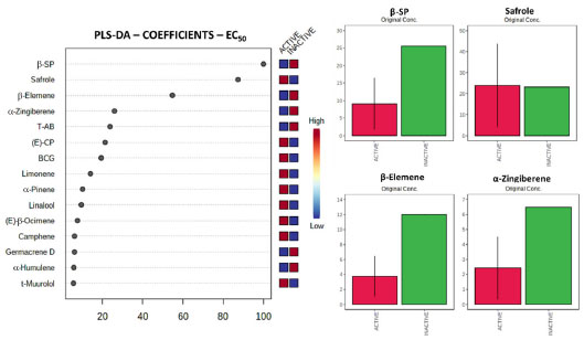 ![]() Figure 1. Coefficient values obtained from the PLS-DA method and the first four compounds exhibiting high coefficients to the classes for EC50. The first four compounds have their average concentrations among classes exhibited. Abbreviations: b-SP - β-sesquiphellandrene, T-AB - Threo-austrobailignan-5, E CP - (E)-caryophyllene, BCG - bicyclogermacrene