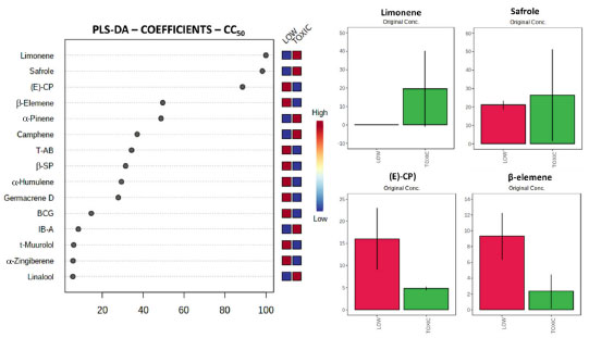 ![]() Figure 2. Coefficient values obtained from the PLS-DA method and the first four compounds exhibiting high coefficients to the classes for CC50. The first four compounds have their average concentrations among classes exhibited. Abbreviations: b-SP - β-sesquiphellandrene, E-CP - (E)-caryophyllene, BCG - bicyclogermacrene, T-AB - Threo-austrobailignan-5, IB-A - Isobornyl acetate