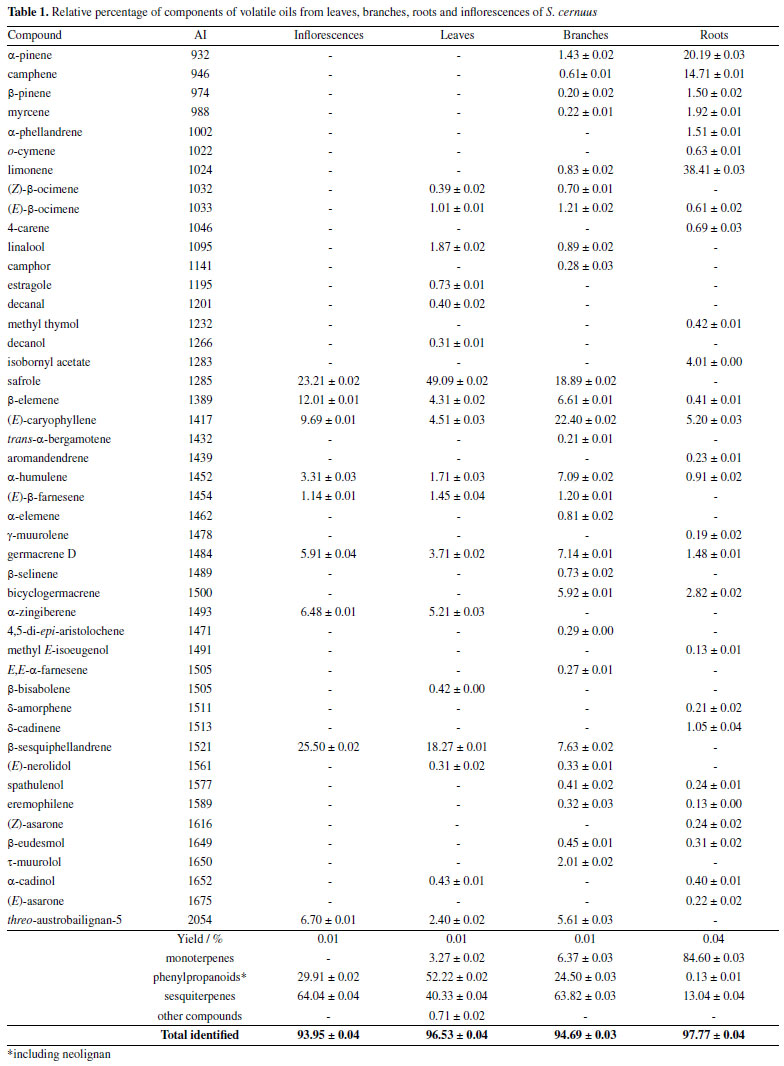 RESULTS AND DISCUSSION Hydrodistillation of leaves, branches, roots and inflorescences of S. cernuus, afforded volatile oils with yields of 0.01, 0.01, 0.01 and 0.04%, respectively. As could be seen in Table 1, 46 compounds were identified distributed in monoterpenes, phenylpropanoids and sesquiterpenes besides other minor metabolites. Inflorescences and leaves oils showed a reduced diversity of volatile compounds - nine and 18 compounds, respectively, corresponding to 93.95% and 96.53% of the total identified. On the other hand, in the branches and roots oils were observed a higher metabolic diversity with 28 (94.69%) and 27 (97.77%) compounds, respectively.