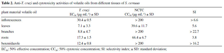 Sesquiterpenes were detected in high concentration compounds in all studied oils, except that from roots, with emphasis on inflorescences (64.04%) and branches (63.82%). Despite of the amounts of sesquiterpenes in the leaves oil (40.33%), the phenylpropanoids were found as predominant compounds (52.22%). On the other hand, the oil from roots showed to be composed mainly by monoterpenes (84.60%). Analyzing the relative percentage of each component in the studied oils, those obtained from inflorescences and leaves were composed mainly by β-sesquiphellandrene (25.50 and 18.3%) and safrole (23.21 and 49.09%), respectively, being this phenylpropanoid also detected in high amounts in branches (18.89%) but absent in roots oil. The sesquiterpenes (E)-caryophyllene and β-elemene were the only compounds found in all studied oils with relative concentrations ranging from 4.51 - 22.4% and 0.41 - 12.01%, respectively. The volatile oil from roots exhibited a different profile being composed, predominantly, by the monoterpenes limonene (38.4%), α-pinene (20.2%) and camphene (14.7%). It must be highlighted that the occurrence of the neolignan threo-austrobailigan-5, in the inflorescences (6.70%), leaves (2.40%) and branches (5.61%) oils. This compound, biosynthetically related to safrole, was also isolated from the MeOH extract from leaves of S. cernuus.18 In a previous study conducted with aerial parts of S. cernuus collected in United States of America, it was observed that the volatile oil is mainly constituted by sesquiterpenes with higher concentration of β-bisabolene (12.30%) and α-curcumene (7.03%).17 Comparatively, the oil from S. chinensis31 was predominately composed by sesquiterpenes being δ-cadinol, δ-cadinene and trans-phytol the main identified compounds, with 22.5, 19.7 and 13.7%, respectively. Considering other species of Saururaceae such as Houttuynia cordata, it was observed the predominance of terpenes and polyketides as volatiles from flowers, leaves, stems, rhizomes, and roots. As reported, the main identified compound in analyzed oils was 4-tridecanone whereas myrcene was the most frequent monoterpene in flowers, leaves and stems, while in rhizomes and roots was detected the predominance of β-pinene. 1-Decanal was the most common occurring polyketide in the leaves and stems oils but in reduced amounts in flowers, rhizomes and roots oils.32 According to the obtained results in the present study, the analyses of volatile oils from different tissues of S. cernuus showed an expressive chemical variety in their composition, in accordance with literature,17 since the sesquiterpenes were detected as predominant metabolites. The volatile oils from S. cernuus were submitted to evaluation of the in vitro anti-T. cruzi activity (trypomastigote forms) and cytotoxicity in mammalian cells (NCTC). The obtained results (Table 2) revealed that the oils were active against the parasite being those obtained from leaves and branches with higher potential (EC50 values of 7.1 and 8.8 μg mL-1, respectively) in comparison to inflorescences and roots oils (EC50 values of 17.3 and 30.4 μg mL1, respectively). Considering the cytotoxicity, leaves and roots oils exhibited CC50 values of 39.6 and 66.4 μg mL-1, respectively, while oils from branches and inflorescences were nontoxic to the highest tested concentration (200 μg mL-1). Based on these results, selectivity indexes to the studied oils were calculated as > 6.6 (inflorescences), 5.6 (leaves), > 22.7 (branches) and 3.8 (roots). Positive control (benznidazole) resulted in an EC50 of 12.4 μg mL-1 and a CC50 > 200 μg mL-1, with a SI > 16.2. Based on these results, it was possible to observe that the volatile oil from branches of S. cernuus exhibited a similar effect of benznidazole being, thus, relevant for future studies including non-clinical trials aiming at its uses for medicinal purposes.