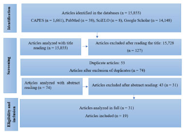 The analysis process began with evaluation of the title, followed by the reading of the summaries of the publications in order to verify if they contemplated the research question and if they met the established inclusion criteria. After the preselection, the studies were read in their entirety in order to avoid selection bias. The final sample consisted of 19 selected articles. To collect information relevant to the study, a literature review protocol was used, and an Excel software database was prepared with the information: author(s), year of publication, journal of publication, database, ligands and metal complexes. The synthesis and critical analysis of the results are presented in the next section.