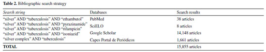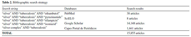 METHODOLOGY This work is an integrative review of the literature, elaborated from the delimitation of the theme and the guiding question, formulation of objectives, definition of inclusion and exclusion criteria, identification, selection, categorization and evaluation of studies, interpretation of results and presentation of the known syntheses.10 Data collection occurred in December 2020 and was redone between 4th and 8th May 2021. Searches were performed on SciELO, PubMed, Google Scholar and Capes Portal de Periódicos, using the descriptors: "silver", "tuberculosis", "ethambutol", "pyrazinamide", "rifampicin", "isoniazid" and "silver complex". As inclusion criteria for the selection of the studies of this integrative review, articles published between 2010 and 2020, in national and international journals, written in English, addressing the synthesis, characterization and in vitro biological analysis of Ag(I) complexes were reviewed. The following texts were excluded from the study: editorials, theses, dissertations, books, congress abstracts, review studies, articles that did not fit into the time frame or did not meet the proposed objective. Articles found in more than one database were considered only once. The time frame from 2010 to 2020 is justified by the need to seek updated evidence on the subject in question. Systematic reviews found during the search procedure were not included in the presentation of results but were used to deepen the discussion of this study. Table 2 shows bibliographic search strategy and Figure 2 shows flowchart illustrating the study selection process according to the PRISMA recommendation.11