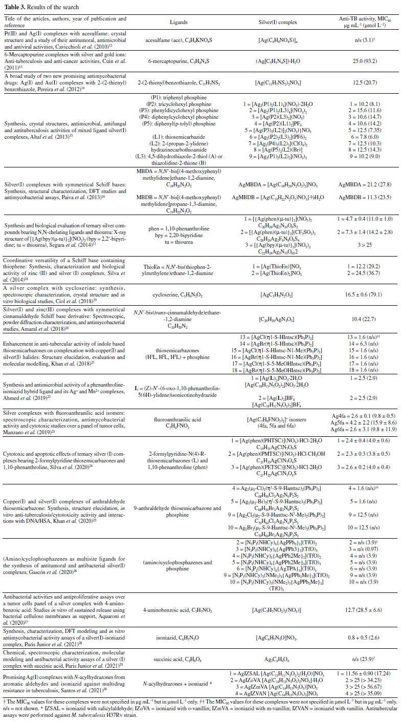 CONCLUSIONS Tuberculosis has been one of the deadliest diseases worldwide for ages. Anti-TB treatments have been efficient, but new drugs and alternative treatments are needed to reduce the number of people infected by this disease mainly because of the occurrence of multidrug resistant TB strains bacteria. The standard treatments basically use four first-line drugs: isoniazid, rifampicin, pyrazinamide and ethambutol. Despite the efficiency of these drugs, used since 1960, or their combination with other drugs, the cases of TB deaths continue to grow. Second-line drugs have also been used for the same reasons. This line includes drugs of the fluoroquinolones and aminoglycosides classes. Metal complexes are presented as alternatives/options for anti-TB treatments. There are no cases of TB treatments using metal complexes but research in this area shows that they could be important and used in the future as adjuvants in eradicating the bacteria that contaminate environments and many surgical materials and objects. Silver is not considered an essential metal for living organisms. On the contrary, it is considered toxic, but many new complexes have been prepared and tested for use against diseases such as tuberculosis, cancer, leishmaniasis and others, and also to prevent contamination by bacteria in cases of severe burns. In the present work, 19 articles were selected and 55 Ag-complexes that have proven to be efficient against the TB bacillus were analyzed. Many of them described synthesis and structural features involving Ag-complexes with various types of ligands. In general, the complexes showed greater efficiency than the organic molecules used as ligands. There are suggestions for Ag(I) complex action by comparison with other metal ions, including Pt(II). The mechanisms of action are not well elucidated, but there are good prospects for further biological studies of the action of the complexes. So they can be used as drugs in the future for the treatment of TB, cancer and other diseases.