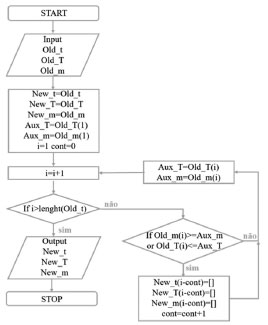 Os testes termogravimétricos do sorgo lignocelulósico foram realizados utilizando o analisador Shimadzu DTG-60H TGA/DTA. As medidas foram feitas usando purga de nitrogênio a 30 mL min-1. Amostras de aproximadamente 6 mg foram analisadas nos testes. O material foi primeiramente aquecido a 373 K com taxa de aquecimento constante de 50 K min-1 (a máxima taxa de operação do equipamento), essa temperatura foi mantida por 30 min a fim de eliminar a umidade. Depois da secagem, o material foi aquecido até 1173 K para avaliar sua degradação térmica. Diferentes taxas de aquecimento foram utilizadas: 5, 10, 15, 20 e 25 K min-1. Diferentes taxas de aquecimento foram empregadas para minimizar os efeitos da transferência de massa e calor no cálculo dos parâmetros cinéticos.15 Adicionalmente, os testes foram feitos em triplicata. Dados de massa, tempo e temperatura foram registrados utilizando o software do equipamento, gerando dados de massa e temperatura a cada segundo de análise. Os dados correspondentes aos primeiros 30 min da reação não foram considerados; uma vez que nesse período há a perda de massa de água, antes do início da reação.24 Para cada análise foi considerada a linha de base referente à calibração da taxa de aquecimento usada, objetivando reduzir os efeitos de medição causados pela presença do gás de arraste.23 Construção do algoritmo Para dados não-isotérmicos de TGA, é esperado uma tendência decrescente para os valores de massa, assim como uma tendência de acréscimo nos valores de temperatura. No entanto, há alguns pontos que não seguem essas tendências, devido aos erros sistemáticos do procedimento experimental; objetivando o maior detalhamento do comportamento de degradação da biomassa, utiliza-se o registro de dados a cada segundo de pirólise, o que pode gerar as variações de medida mencionadas. Tais erros podem causar a geração de uma curva de derivada de conversão com muitas flutuações.19 Visando reduzir a influência de tais flutuações, o tratamento de dados inclui a remoção dos pontos que não seguem as tendências de decréscimo para massa e de acréscimo para temperatura, além dos pontos do estágio de desidratação, com base em metodologia recentemente proposta.19 A derivada dos dados de conversão em função da temperatura pode ser calculada utilizando o método de diferenças finitas. A derivada da conversão pela temperatura foi calculada segundo a equação 3.19 ![]() Considerando o modelo de Friedman, valores de T, α e dα/dT são utilizados para cálculo de Ea. Usualmente, esses valores são calculados utilizando um método de interpolação. Alguns métodos de interpolação comumente utilizados são interpolação por pontos vizinhos, interpolação linear e o método de interpolação spline cúbico, o qual foi utilizado no presente trabalho, resultando em uma continuidade real entre os dados. Detalhes do método de interpolação spline cúbico são discutidos em literatura já mencionada.19 O cálculo numérico foi feito utilizando o software Scilab® (versão 6.1.0). O fluxograma para o algoritmo de remoção dos pontos que apresentavam erros é representado segundo a Figura 2. O algoritmo se inicia com a entrada dos dados experimentais de tempo, temperatura e massa; denominados de Old_t, Old_T e Old_m, respectivamente. Posteriormente, são criadas as variáveis que recebem os dados experimentais após a remoção dos pontos erráticos (New_t, New_T e New_m). Duas variáveis auxiliares (Aux_T e Aux_m) são necessárias para carregar o valor do ponto experimental que está sendo avaliado, que inicialmente, é o primeiro ponto do vetor de dados experimentais de temperatura e massa, respectivamente. Após essa inicialização, o algoritmo entra no laço de repetição, no qual a variável cont é inicializada com o valor zero e a variável i com o valor um. No interior desse laço excluem-se os valores de massa maiores ou iguais aos precedentes e os valores de temperatura menores ou iguais aos precedentes. O encerramento do processamento de dados ocorre quando a variável i é maior que o comprimento do vetor Old_t. Assim, após a finalização, o algoritmo fornece um novo conjunto de dados experimentais de tempo (New_t), temperatura (New_T) e massa (New_m).