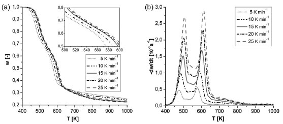 ![]() Figura 3. a) Fração mássica (w) versus temperatura; b) derivada da fração mássica por tempo (-dw/dt) versus temperatura