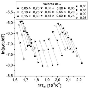 Aliado ao método da remoção de dados erráticos, foi realizado o tratamento de dados segundo a metodologia proposta pelo Comitê de Cinética da Confederação Internacional de Análises Térmicas e Calorimetria, o qual indica a minimização dos efeitos de transferência de calor na escolha dos valores de taxas de aquecimento a serem utilizados para cálculo de parâmetros. Segundo o Comitê, os modelos isoconversionais para materiais lignocelulósicos são mais adequadamente aplicados para a etapa de volatilização dos componentes, ou seja, desconsiderando a etapa de carbonização que ocorre principalmente com a fração de lignina, a temperaturas mais elevadas.23 Assim, selecionou-se, para cada taxa de aquecimento utilizada, a faixa de temperatura referente à etapa de volatilização, ou seja, decomposição principal de hemicelulose e celulose. A análise dos dados foi feita segundo o modelo de Friedman para as conversões de 0,05 a 0,95 com intervalo de 0,05; segundo orientação do Comitê.23 Suavização das curvas de derivadas O conjunto de dados derivativos apresentou ruídos, dessa forma foi feita a suavização da curva da derivada. Os métodos de ajuste não paramétricos comuns incluem a média móvel, Savitzky-Golay, e métodos de suavização de gráfico de dispersão localmente ponderada (LOWESS).19 No presente trabalho foi utilizado o método LOWESS, conforme sugerido pela literatura anterior.19 Para a suavização trabalha-se com os números de pontos de interrupção (n), o qual determina o número de intervalos e cada equação de regressão respectiva a estes intervalos, que, somadas, formam a curva completa. Essa determinação de número de pontos de interrupção foi feita através do software Scilab® (versão 6.1.0), no qual há a disponível uma função na qual há a geração dos gráficos de suavização para um valor de n fornecido. Dessa forma, foram feitos os testes para diferentes valores de n e foi escolhido o valor que melhor representou o conjunto experimental de dados. Comparação entre os dados experimentais e teóricos Após a obtenção dos valores experimentais partindo-se da equação 1, calcularam-se os valores de dα/dT para os valores teóricos pelo método de Runge-Kutta, por meio da equação 4. ![]() sendo ln[Aαf(α)] o coeficiente linear da regressão da equação 1 para cada conversão. Em posse dos dados experimentais (fornecidos pela equação 1) e dos dados teóricos (fornecidos pela equação 4), foi possível realizar a comparação entre os valores da derivada de conversão em função da temperatura através das equações 5 e 6. ![]() ![]() em que z é o número de pontos utilizados, j se refere aos dados referentes a cada ponto utilizado, (y)jexp representa os valores experimentais de derivada de conversão em função da temperatura, (y)jteórico indica os valores calculados de derivada de conversão em função da temperatura. ADP representa o valor de desvio entre as curvas e ymax é o valor experimental máximo de derivada de conversão em função da temperatura. Para o cálculo e geração de gráficos para o desvio entre os dados teóricos e experimentais, as conversões (α) utilizadas foram de 0,005 até 0,995 com intervalo de 0,005; pois a utilização de quantidade maior de dados de Ea, T e ln[Aαf(α)] permite que a curva teórica de dα/dT seja gerada de maneira detalhada, apresentando formatos e alturas de picos da curva mais precisos.