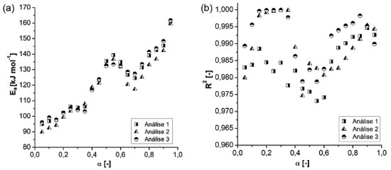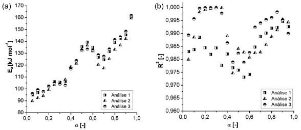 Com a intenção de avaliar os resultados de energia de ativação e os resultados de coeficiente de determinação das regressões lineares para as três análises, os valores de energia de ativação versus conversão (Figura 5 (a)) e os valores de coeficientes de determinação versus conversão (Figura 5 (b)) são apresentados. Nos gráficos o termo "Análises 1" se refere ao primeiro conjunto de análises com taxas de aquecimento 5, 10 e 15 K/min; "Análises 2" representam as réplicas das análises e "Análises 3" as tréplicas.